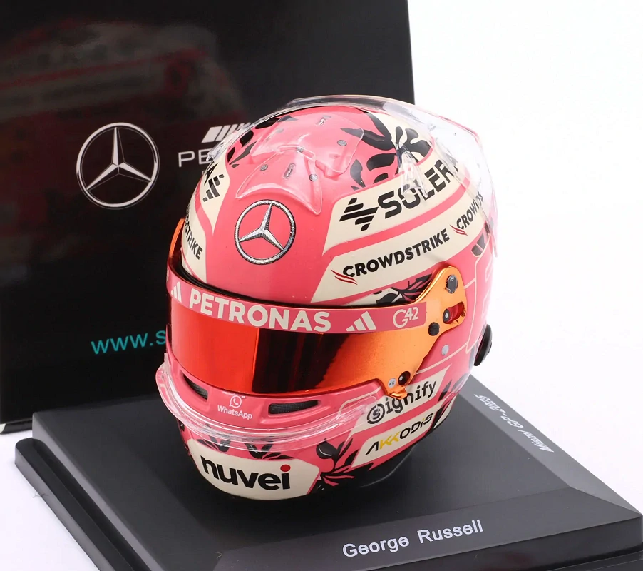 Oficiální replika helma George Russell, originální miniatura helmy v provedení měřítku 1:5 George Russell ze speciální limitované kolekce "F1 MIAMI GP 2025" včetně speciálního podstavce a prezentačního boxu.