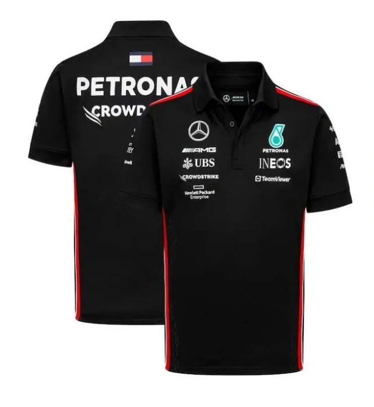 Originální týmové tričko MERCEDES F1 s krátkým rukávem a límečkem POLO AMG Mercedes Benz F1 racing team v černé barvě. Oficiální licencovaný produkt závodního týmu Mercedes, originální replika modelu stáje i jezdců týmu Formule 1 Mercedes AMG, doprava i osobní odběr zdarma.