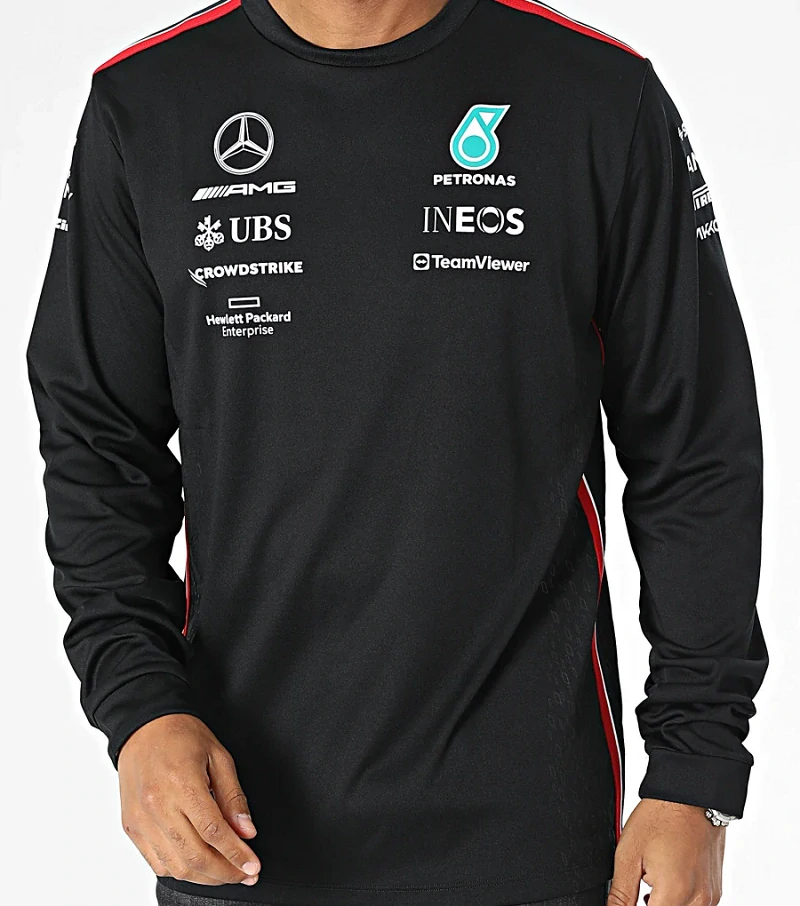 Originální týmové tričko MERCEDES F1 s dlouhým rukávem AMG Mercedes Benz F1 racing team v černé barvě. Oficiální licencovaný produkt závodního týmu Mercedes, originální replika modelu stáje i jezdců týmu Formule 1 Mercedes AMG, doprava i osobní odběr zdarma.